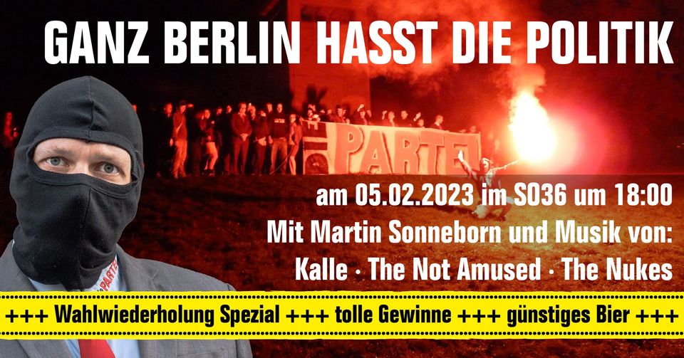 Freut Euch auf einen ausgelassenen Abend mit wunderbare Dankesreden unserer Spitzenkandidatinnen, unterhaltsame Wortbeiträge von EU-Spitzenpolitiker Martin Sonneborn und den vielleicht besten Comedians der Stadt, sowie Musik von hochkarätigen Berliner Bands